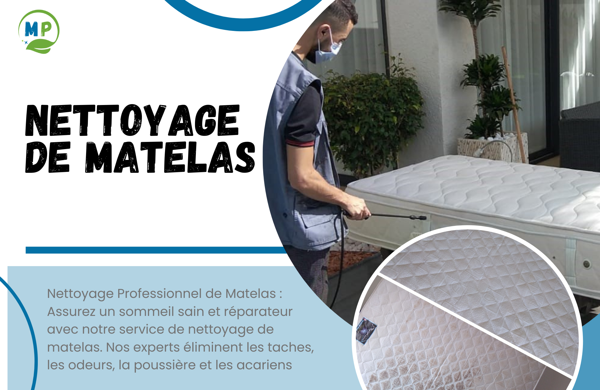 Nettoyage en profondeur, traitement anti-acariens, anti-bactérien et elimination des odeurs.